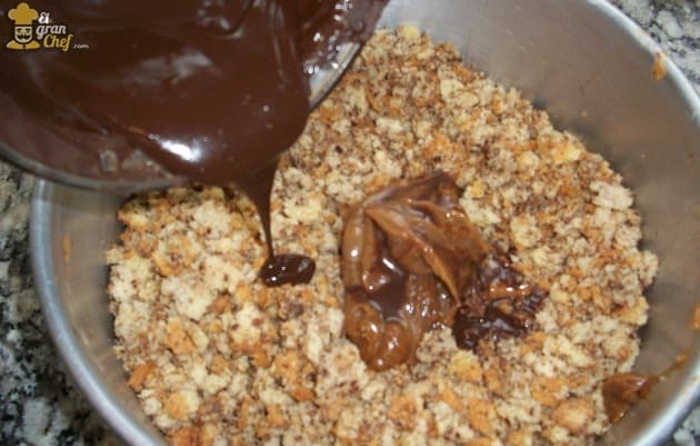 Como segundo paso agregamos el chocolate previamente fundido con la manteca o mantequilla. También el licor y 3 cucharadas de dulce de leche.