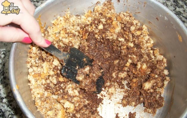 Integramos todo con una espátula hasta lograr una pasta. Si vemos que aún nos cuesta unir la mezcla, agregamos más dulce de leche.