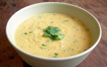 Reitra del fuego y deja enfriar. Cuidadosamente quita el cilantro y la hierba limón. Haz puré con una batidora o con un procesador. Agrega el cilantro picado. Agrega sal, pimienta y una pizca de azúcar si es necesario. Recalienta si es necesario y sirve.