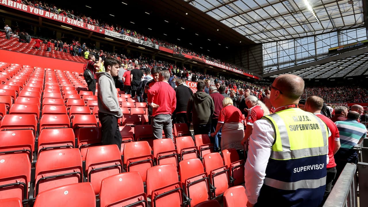 Dos tribunas dentro de Old Trafford — la Sir Alex Ferguson y la Stretford End — fueron evacuadas unos 30 minutos antes del inicio programado del encuentro, a las 3 p.m. (1400 GMT). Inicialmente se permitió que los aficionados de las otras tribunas permanecieran en el estadio.