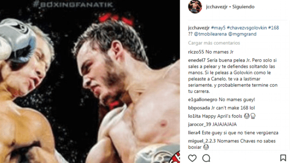 Julio César Chávez Jr. mandó el recadito a través de su cuenta personal de Instagram con un fotomontaje en el que aparece intercambiando golpes con Golovkin acompañado de los hashtags #may5, #chavezvsgolovkin, y #168, dando a entender que su supuesto pleito se llevaría a cabo en peso supermediano.