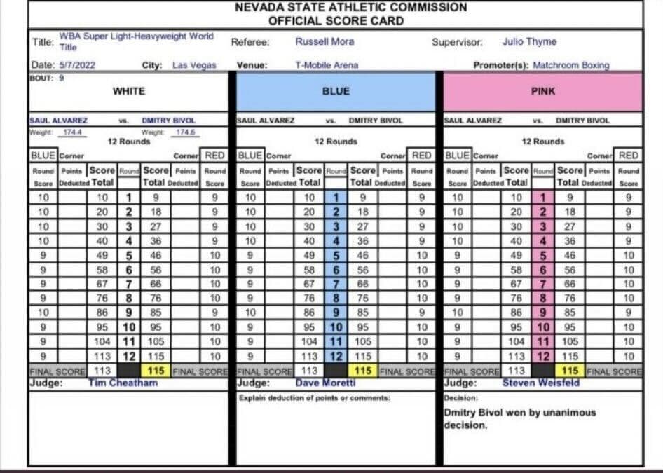 Sin embargo, los últimos tres rounds fueron para Bivol, por lo que el resultado final en las tarjetas de los tres jueces fue 113 para 'Canelo' Álvarez y 115 para Dmitry Bivol, por lo que el ruso se impuso por decisión unánime.