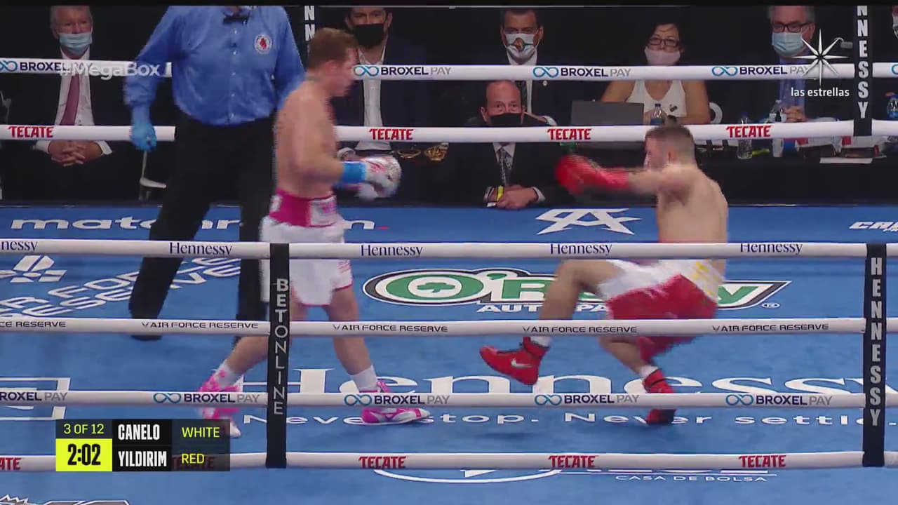 En el tercer round, 'Canelo' nuevamente mostró una buena combinación de golpes y con un upper mandó al turco a la lona que ya no tuvo la fuerza para salir al cuarto episodio.