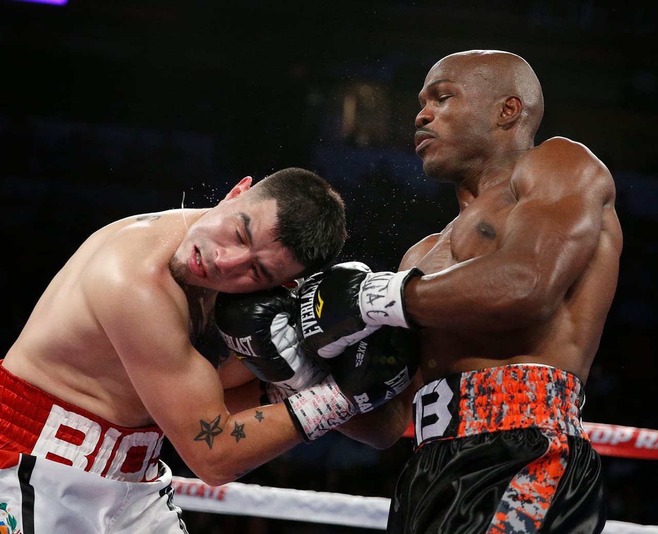 Bradley empezó fuerte, se metió en la guardia de Ríos, lo castigó en corto, el campeón salió con todo, tiro cuatro gachos de izquierda y todos entraron en la cara del retador.