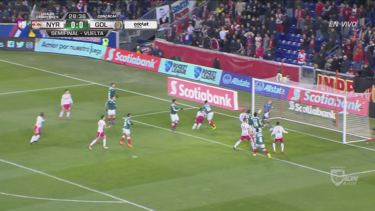 El Red Bulls domina las acciones en su cancha y en una pelota parada estuvo otra vez a punto de abrir el marcador con par de testarazos que pusieron a temblar a los tapatíos.