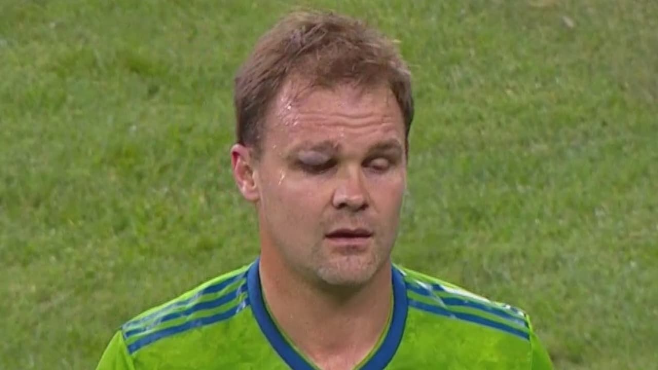 El defensa del Sounders sacó la peor parte en un choque de cabezas con López de Chivas, que le dejó un ojo inflamado peleando un balón dividido.