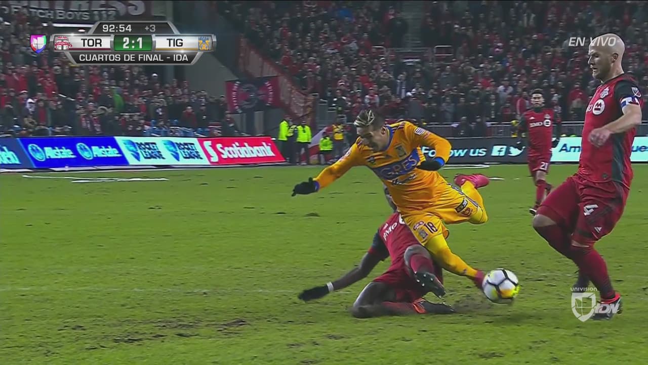 El defensa francés se aventó sobre el balón en la última jugada derribando al argentino de Tigres que reclamaba falta para salvar un empate en Toronto.