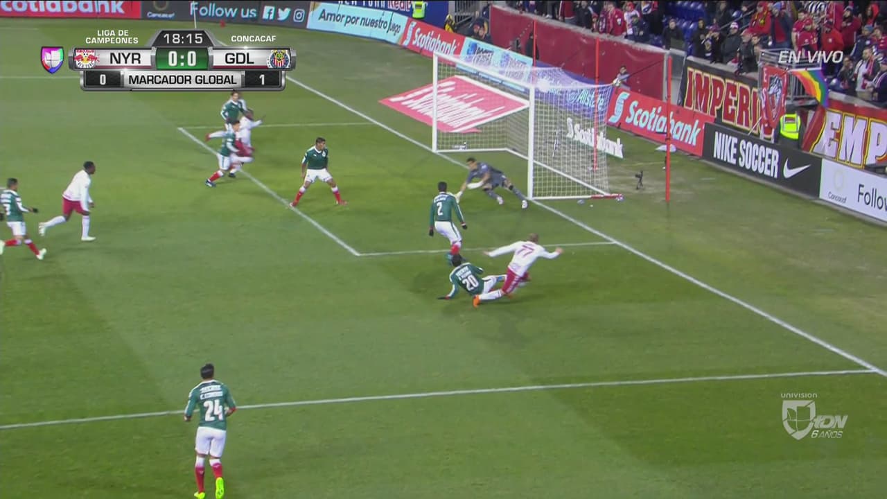 El New York Red Bulls no baja la intensidad y está muy cerca de marcar el 1-0 con un disparo del austriaco que vio pasearse la zaga rojiblanca.