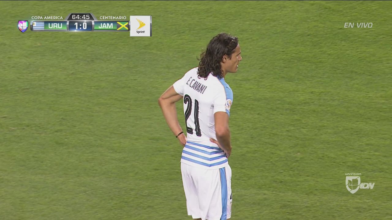 Edinson Cavani mete un remate de cabeza que se estrella en el poste de Jamaica