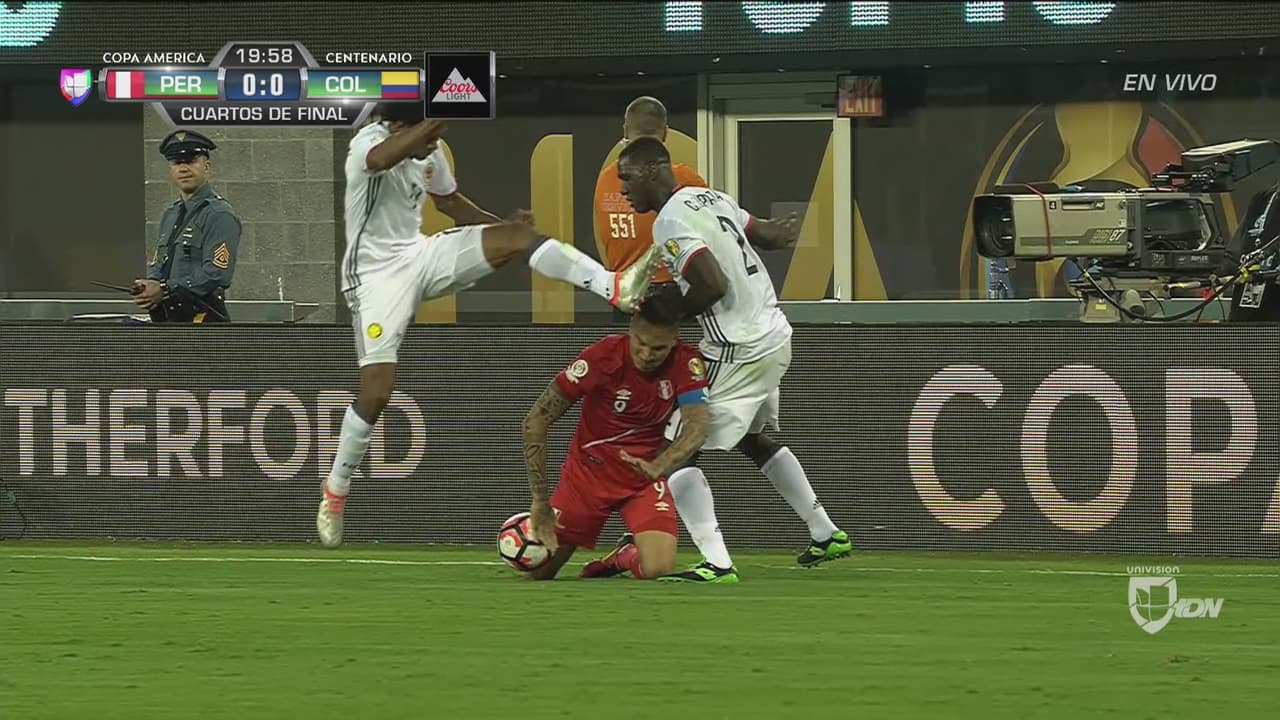 El colombiano Cuadrado entra con fuerza a un balón cuando Paolo Guerrero caía y termina pateándole en la cara..