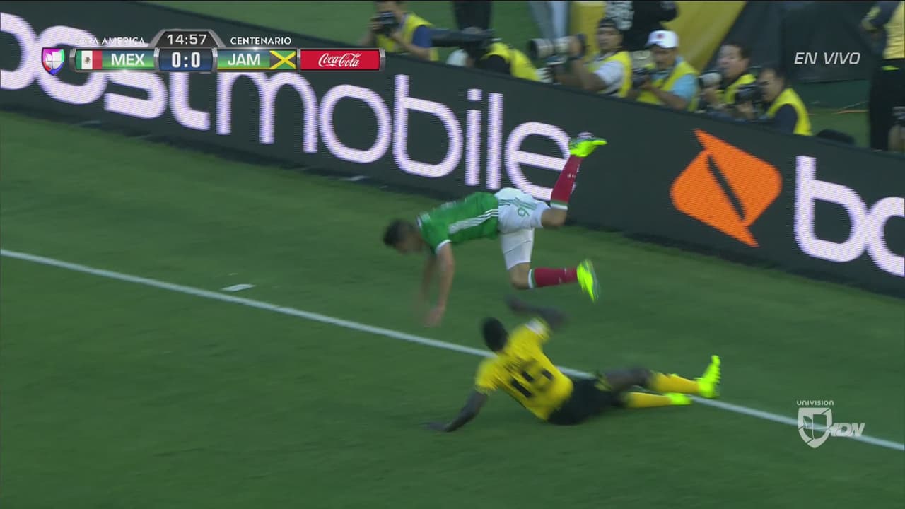 Una violenta barrida de Watson mandó a Raúl Jiménez contra la valla publicitaria. Por fortuna no hubo lesión del mexicano..