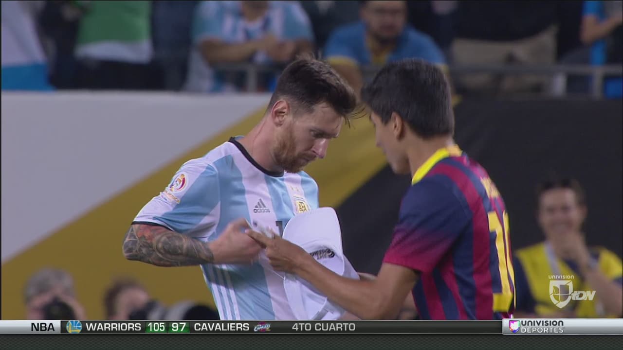 Después de conseguir un triplete, el delantero argentino le dio un autógrafo a un aficionado que invadió el campo para abrazar a Messi.