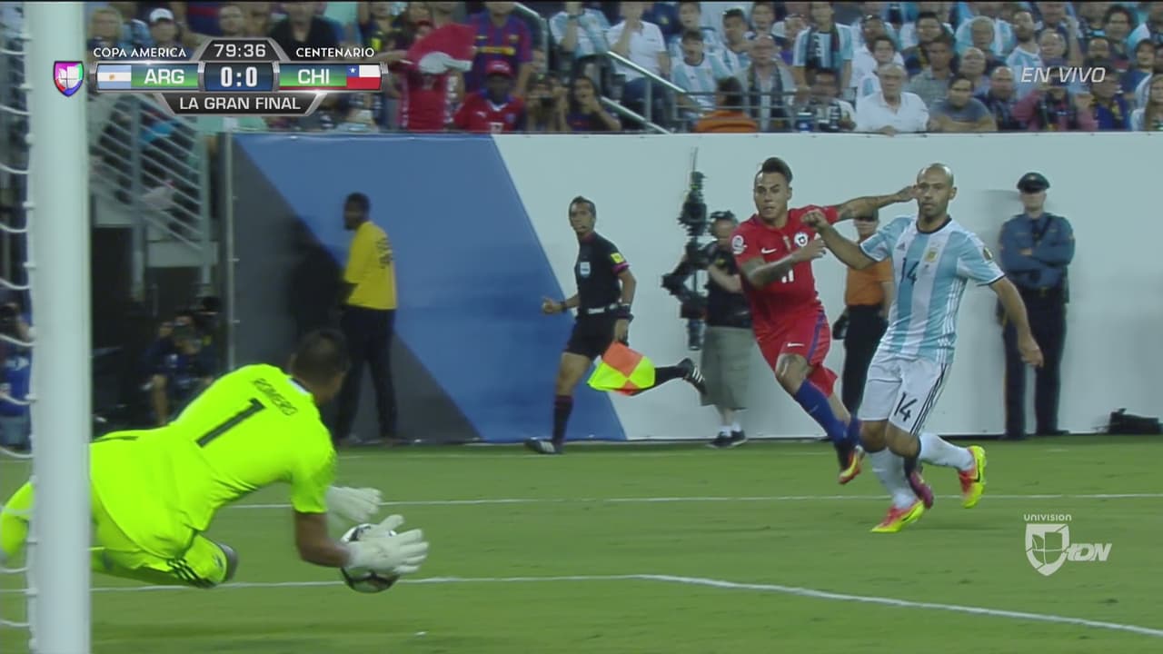 El portero de argentina se estiró y paró in extremis un disparo peligroso del chileno en la final de la Copa América Centenario.