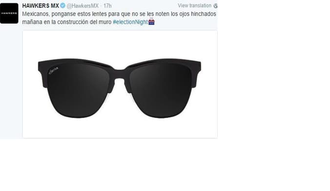 Con motivo de las elecciones en Estados Unidos, la marca de lentes Hawkers, patrocinador del piloto de Fórmula Uno, puso un polémico mensaje en su cuenta oficial en Twitter, en el que se refería a los mexicanos por la victoria del ahora presidente electo Donald Trump.