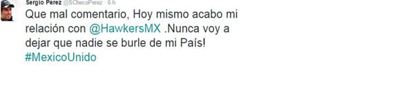 "Que mal comentario, hoy mismo acabo mi relación laboral con @HawkersMX. Nunca voy a dejar que nadie se burle de mi país! #MexicoUnido", escribió el piloto.