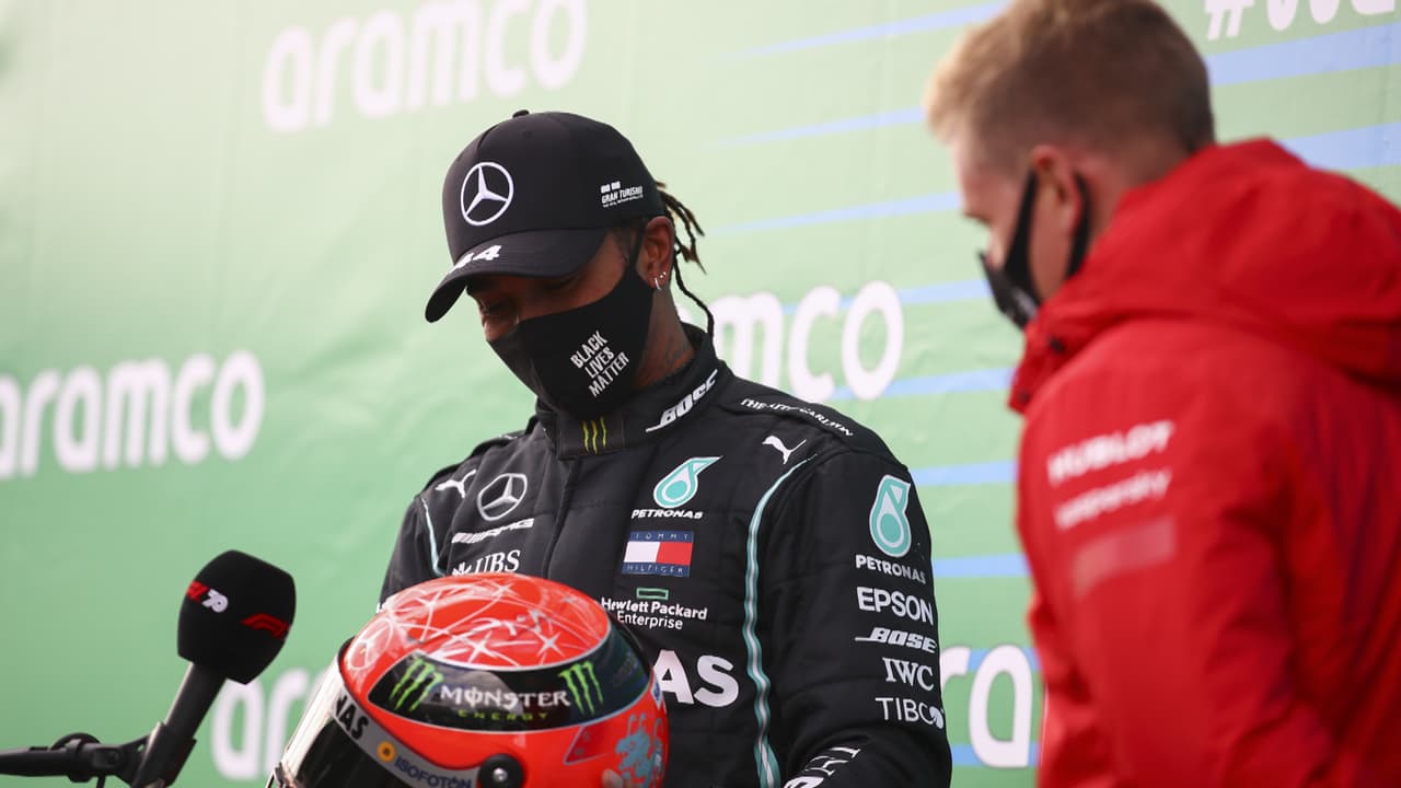 Lewis Hamilton recibe casco de Michael Schumacher tras igual récord de victorias en F1