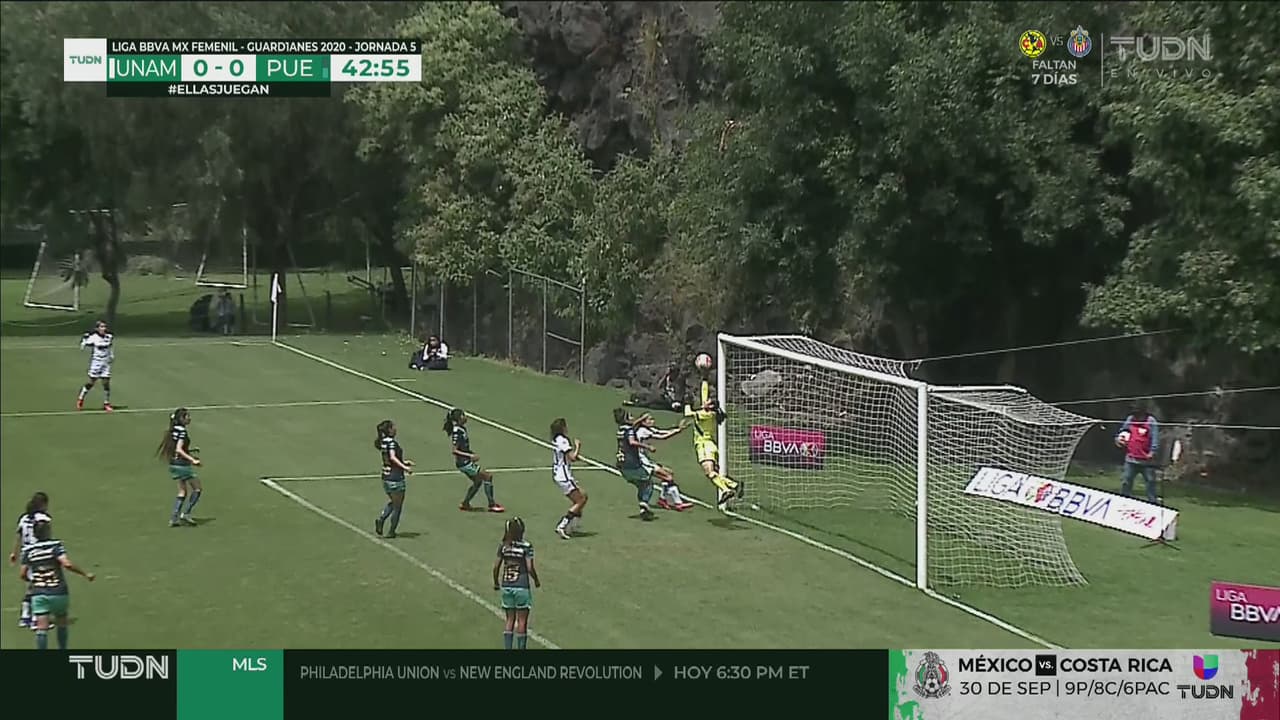 La ‘10’ del cuadro universitario tomó un rechace a las afueras del área, mandó el balón a segundo poste, ya se andaba colando, pero Brissa reaccionó al 43’.