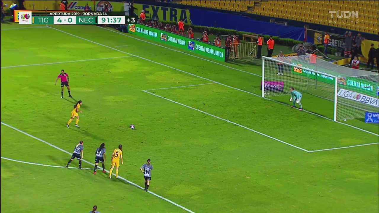 La capitana de Tigres falla desde el manchón blanco ante la gran portera de Necaxa.