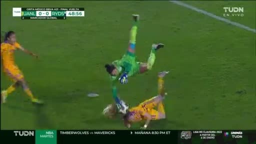 La portera de Rayadas ganó el esférico y luego se llevó con todo a la delantera de Tigres al 48’.