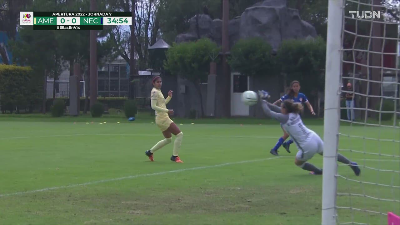 La portera de América aguanta atrás para tapar el intento de la atacante de Necaxa, al 34'.