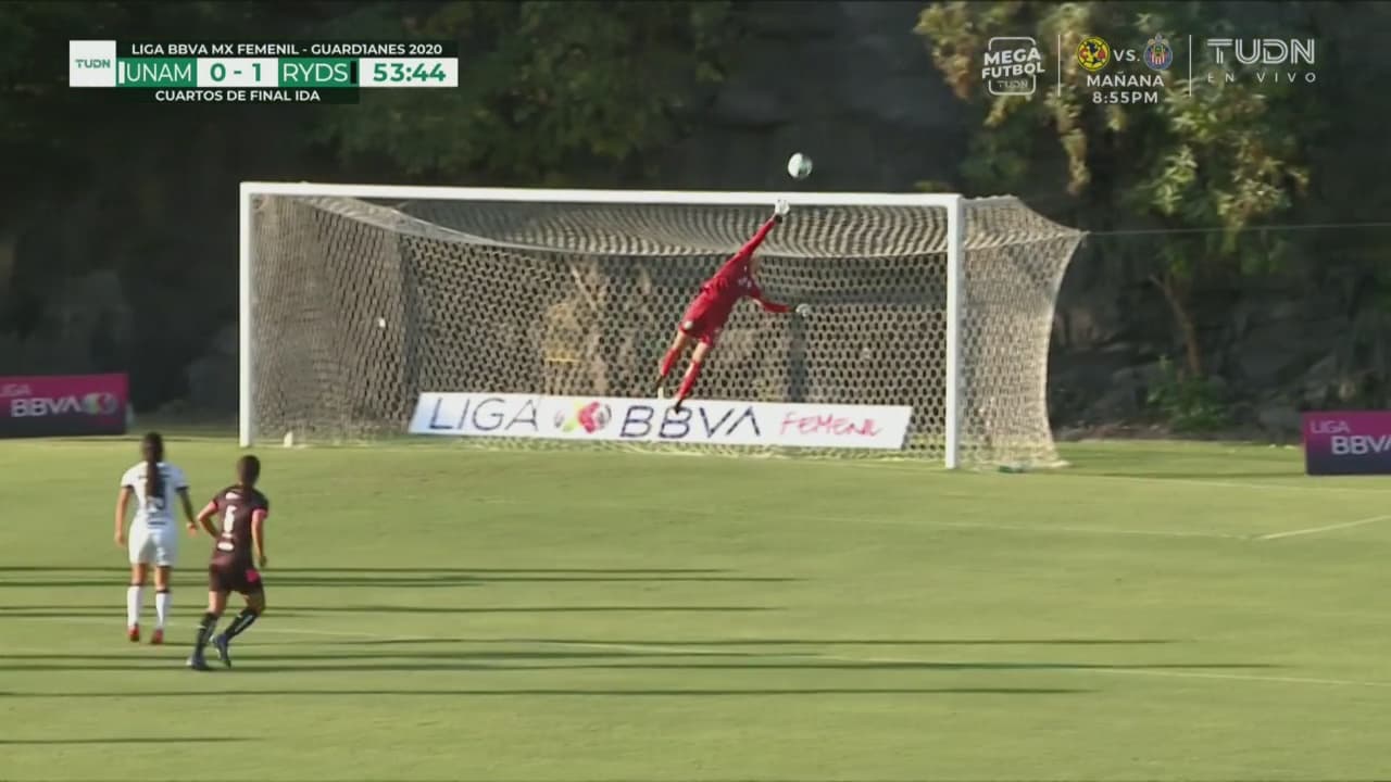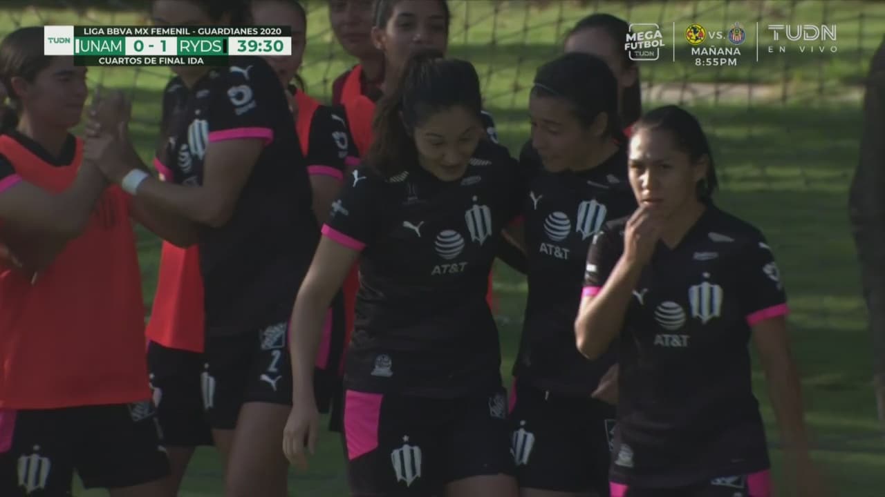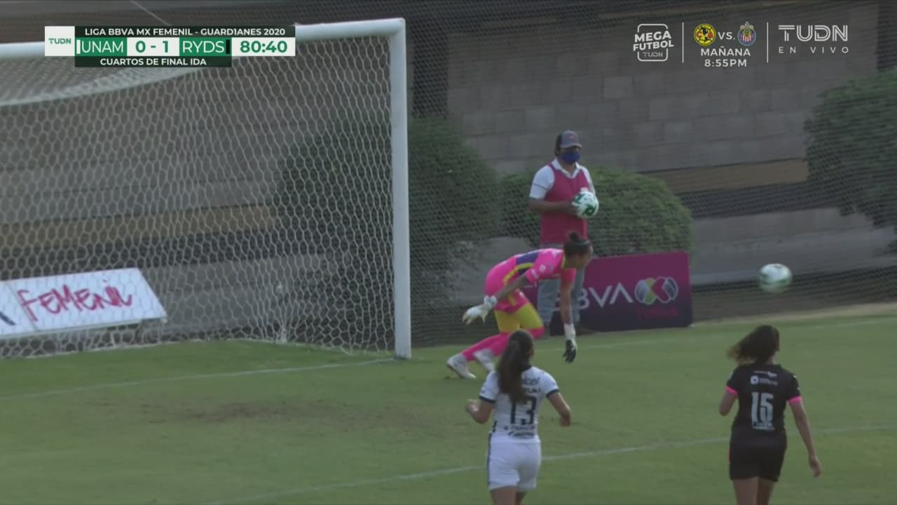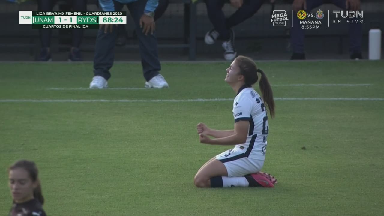 Rayadas debió ahogar el festejo, pues después de su gol, Pumas Femenil se fue al frente y tanta fue la insistencia que el gol al fin llegó. Antes, la portera Alejandrina Godínez, del cuadro regiomontano, hizo una estupenda atajada a una mano pegado al travesaño.