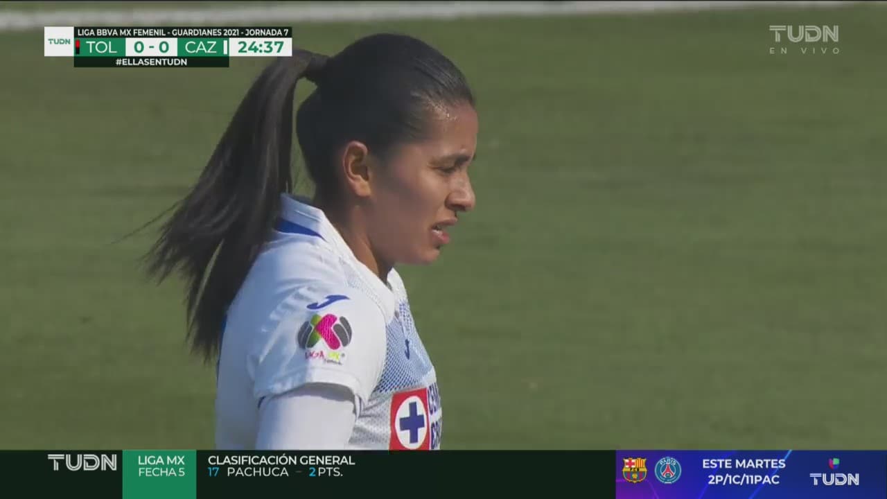 La jugadora terminó un embate lleno de paredes, pero la portera de Toluca controló el tiro al 24’.