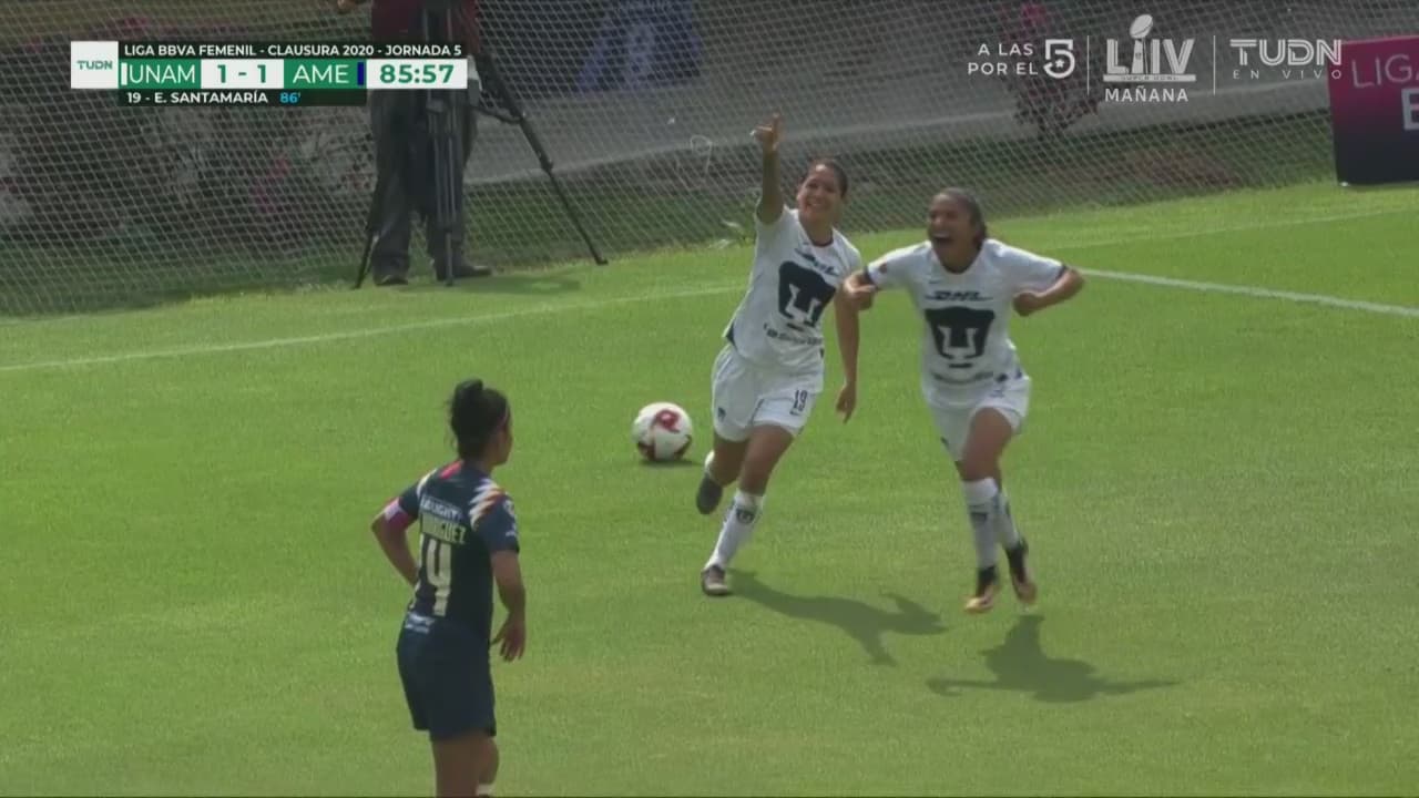 Ya cuando faltaban cinco minutos para el final del compromiso, luego de un entrevero dentro del área de las americanistas, Edna Santamaría anotó, de cabeza y sin oposición alguna, el 1-1 con el que terminó el choque.