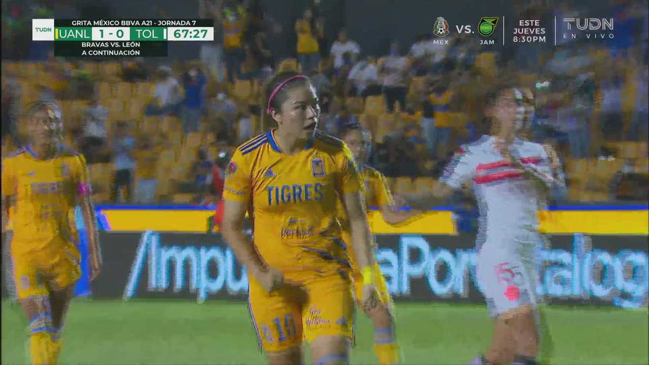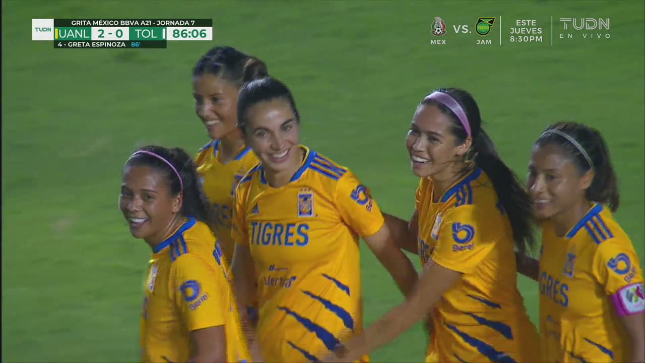 El segundo gol llegó al minuto 85 y fue obra de Greta Espinoza, que con su buen resorte se levantó en el área y de cabeza mandó guardar el esférico. Tigres se destapó en los últimos minutos rumbo a la goleada.
