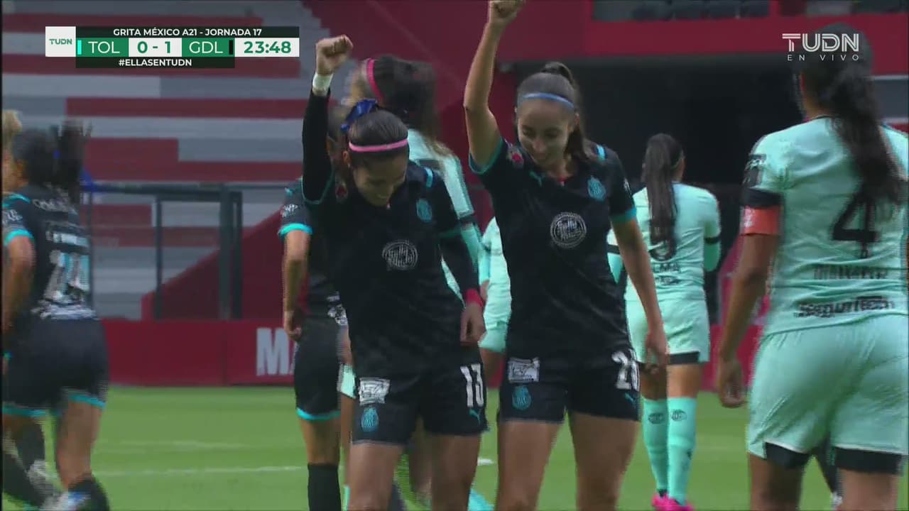 Toluca Femenil también tuvo sus ocasiones, primero con Brenda Carvajal tras un error en la salida de a portera Celeste Espino, apenas al minuto 41’; y luego con un tiro al travesaño de Diana Guatemala. Aunque también el quinto de Chivas Femenil estuvo cerca de caer con un zurdazo de Kristal Soto que no encontró las redes.