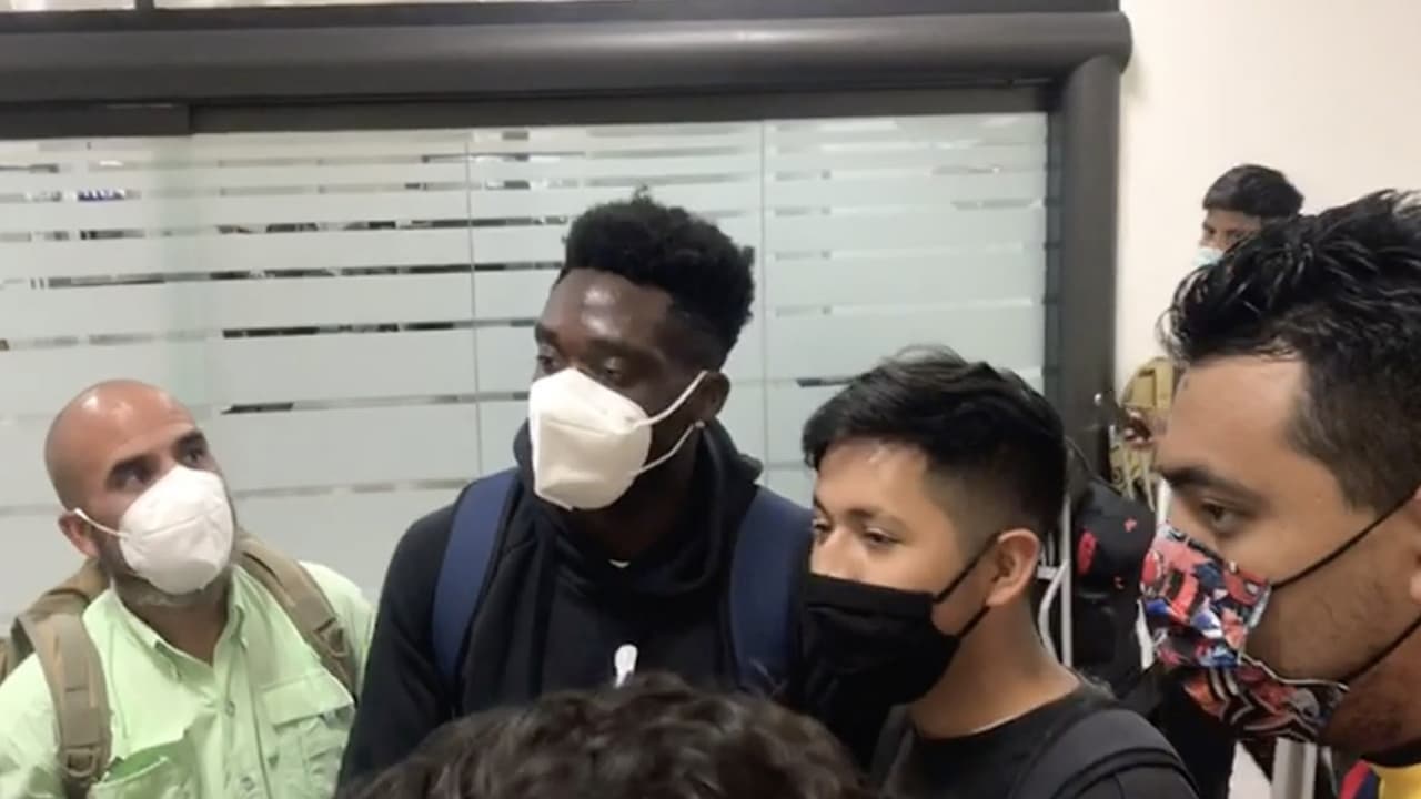 El jugador canadiense del Bayern Múnich atendió a algunos aficionados a su arribo al aeropuerto de la Ciudad de México.
