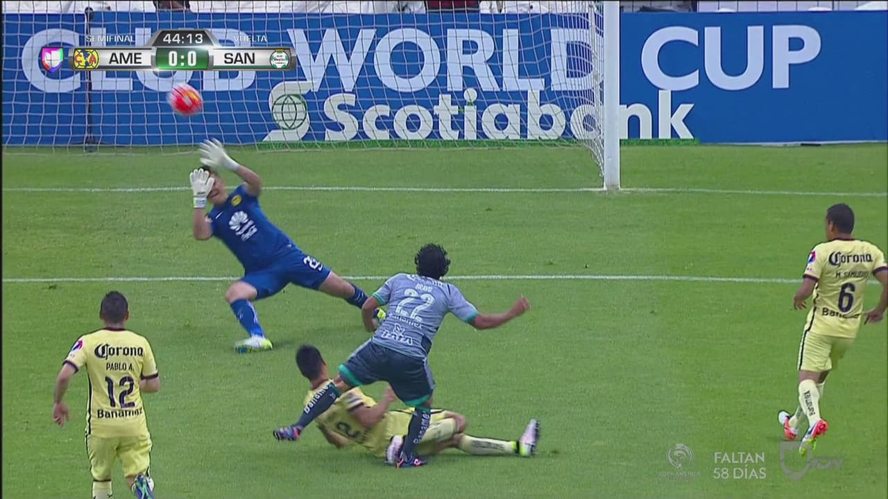En la mejor jugada de Santos en la primera mitad, el delantero casi aprovecha una mala salida de Paolo Goltz para anotar.