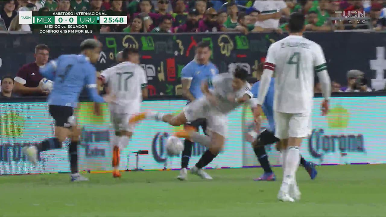 El jugador del Tri buscaba el esférico, pero el defensor charrúa llegó a atropellarlo sin miramientos.