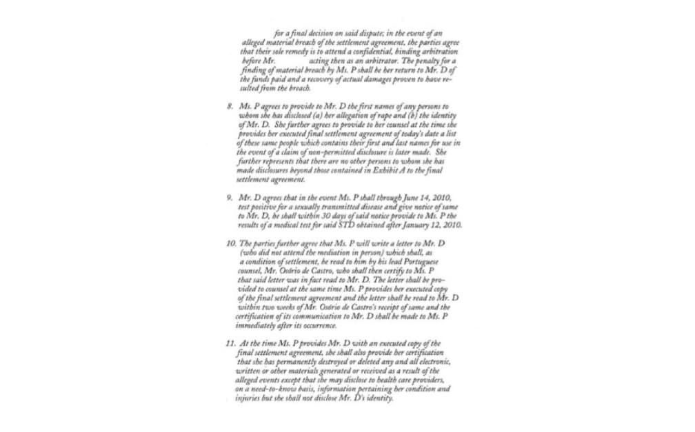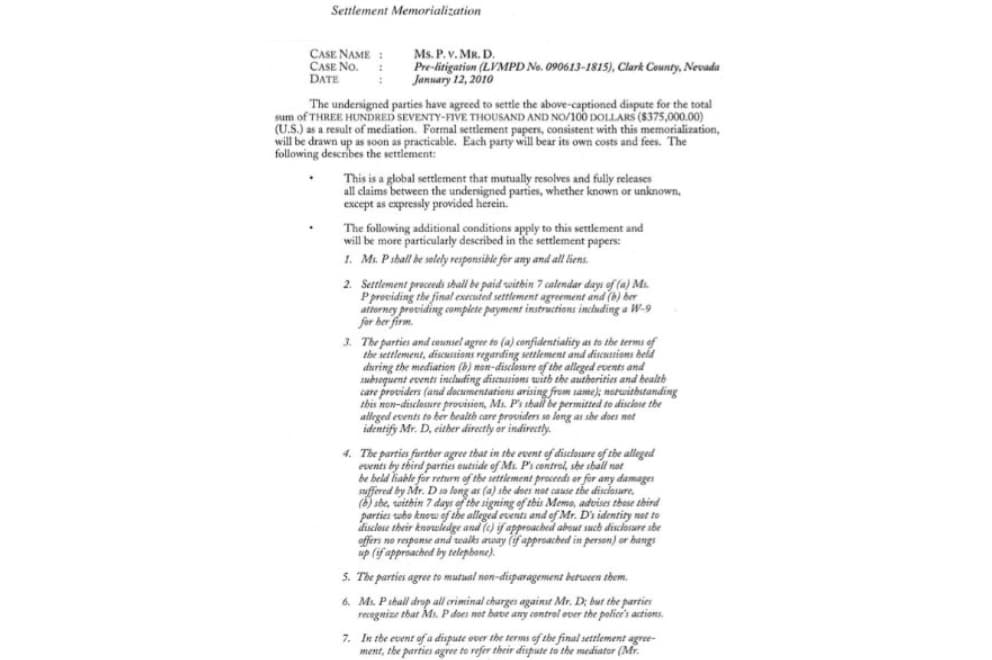 -En tercer lugar está el acuerdo por 375 mil dólares al que llegaron los abogados de ambas partes en enero de 2010. En la primera hoja se pide que Mayorga abandone los cargos criminales y no hable sobre el caso.