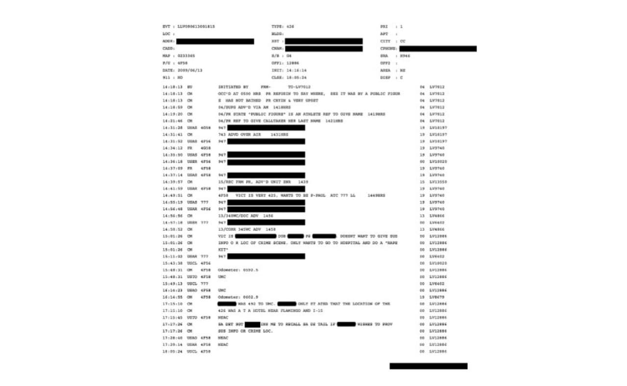 -En primer lugar se presentó el informe de la policía de Las Vegas del 13 de junio de 2009, en el que Kathryn Mayorga relata una agresión sexual en su contra, allí se explica que un futbolista había abusado de ella, aunque se niega a proporcionar el nombre y los detalles.