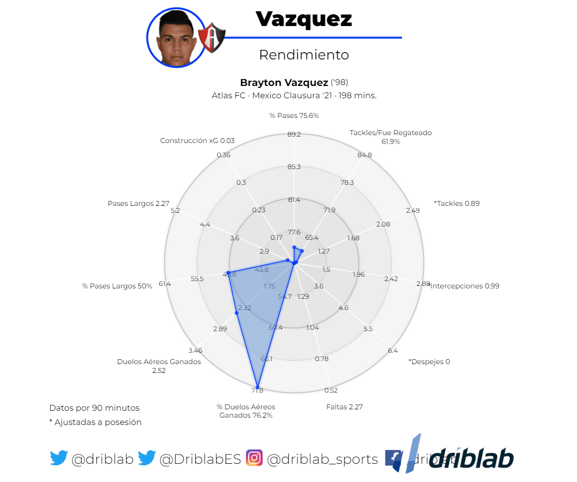 Vázquez es defensor central, diestro de nacimiento, puede jugar por ambos lados en la central y además como lateral derecho. El canterano del Atlas subió al equipo para el Apertura 2019 de la Liga BBVA MX.