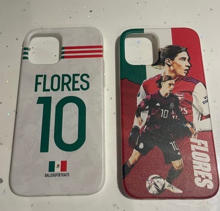 Entre los accesorios que Marcelo Flores mostró en su cuenta de Instagram también aparecen dos carcasas para su teléfono celular. La primera tiene el apellido Flores con el número 10 en un fondo blanco y las franjas verdes y rojas que emulan la playera de la selección mexicana.