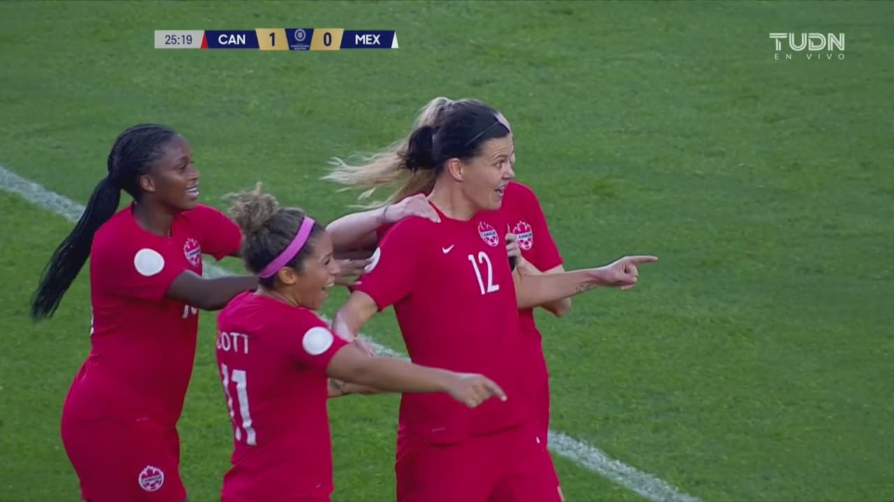 El primero de Canadá llegó al minuto 26 cuando por la banda derecha Beckie y Riviere hicieron una gran pared para que la última sirviera a Christine Sinclair, quien remató sin marca dentro del área con pierna derecha, venció a la arquera Emily Alvarado y abrió el marcador en el H-E-B Park.