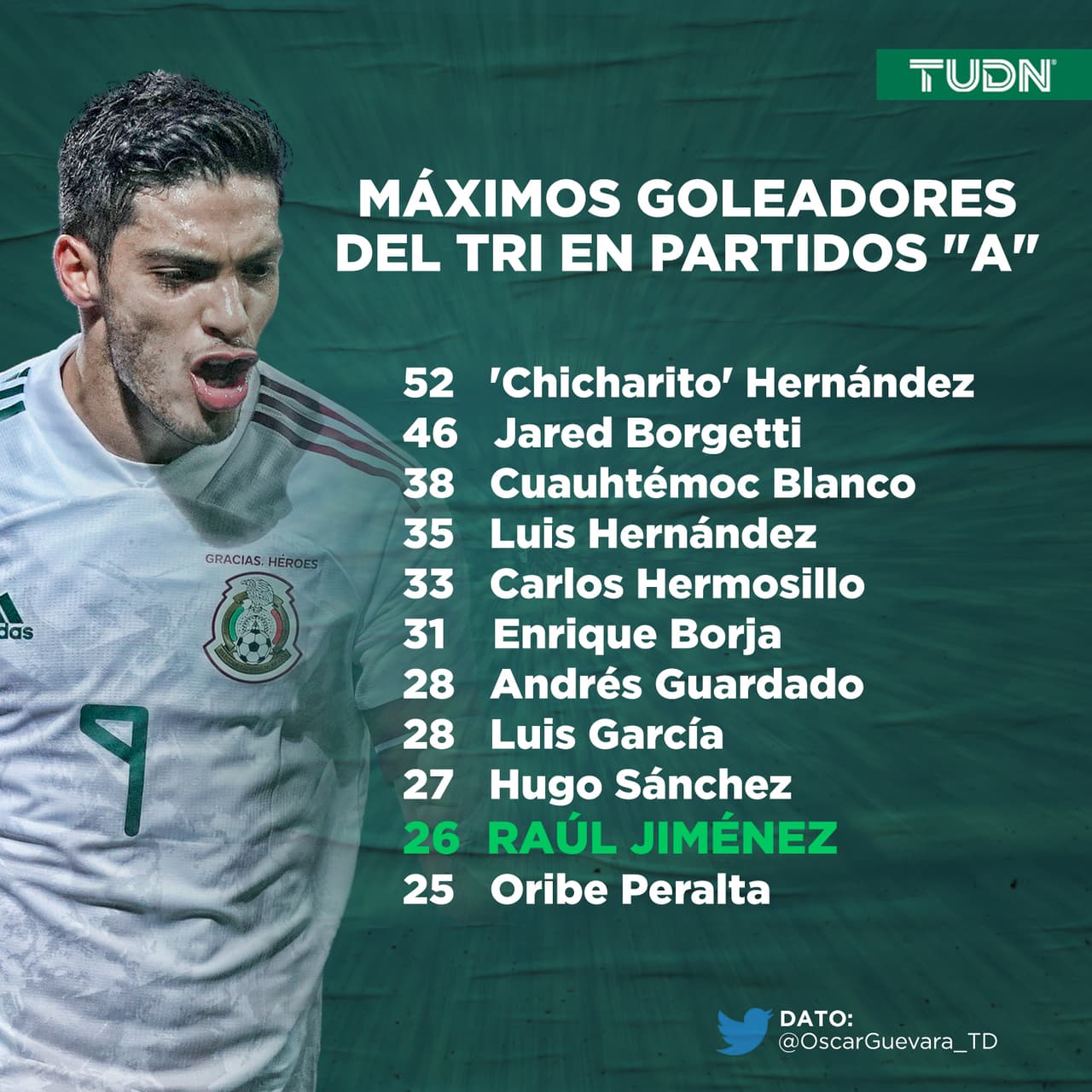 En el top 10 de goleadores del Tris sólo se encuentran tres jugadores en activo; Chicharito, Andrés Guardado y el propio Raúl Jiménez.
