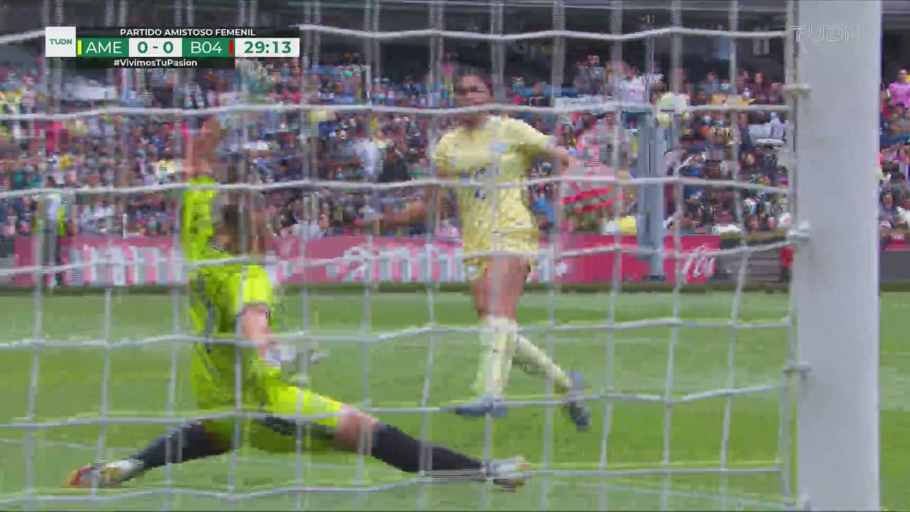 Pelota filtrada que le llega a la delantera del América, cruza el disparo, pero hay portera, al 29'.