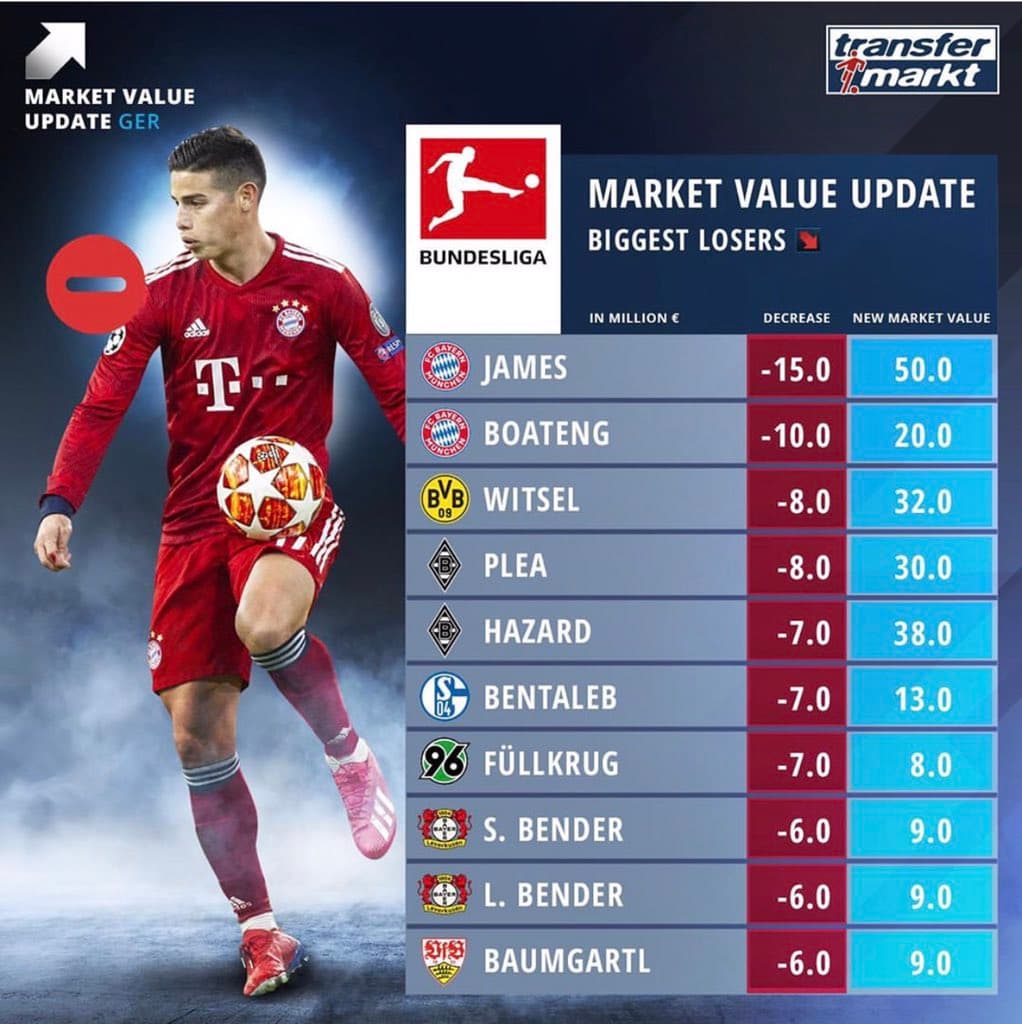 James lidera la lista de los 10 jugadores que más valor perdieron en la Bundesliga