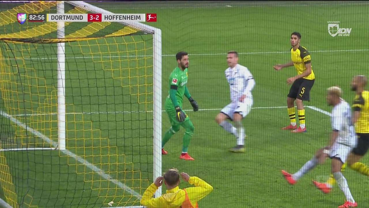 El Hoffenheim no baja los brazos y aprovecha que la defensa del Dortmund está dormida. Un error imperdonable de Hakimi en la marca a balón parado permite que los visitantes recorten la distancia.