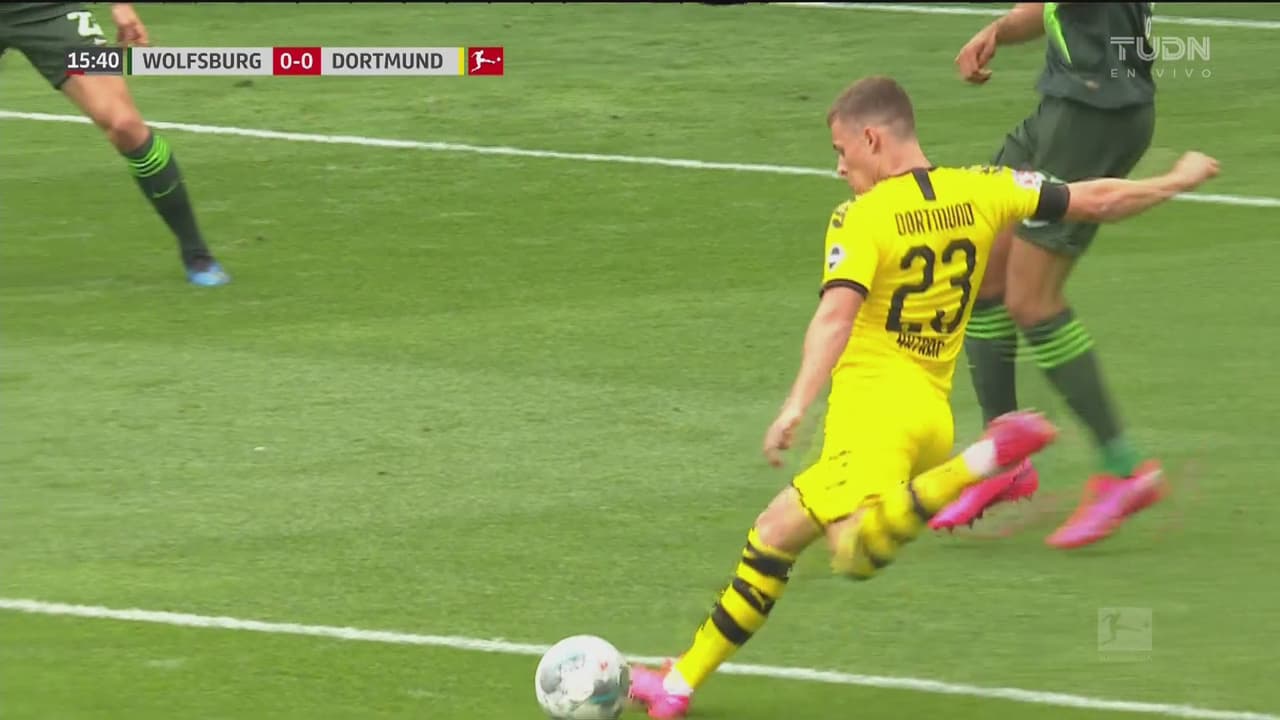 El volante del Dortmund recibió el balón en los linderos del área, hizo un amague con la pierna derecha, pero disparó de zurda por arriba del metal del Wolfsburg al 16’.