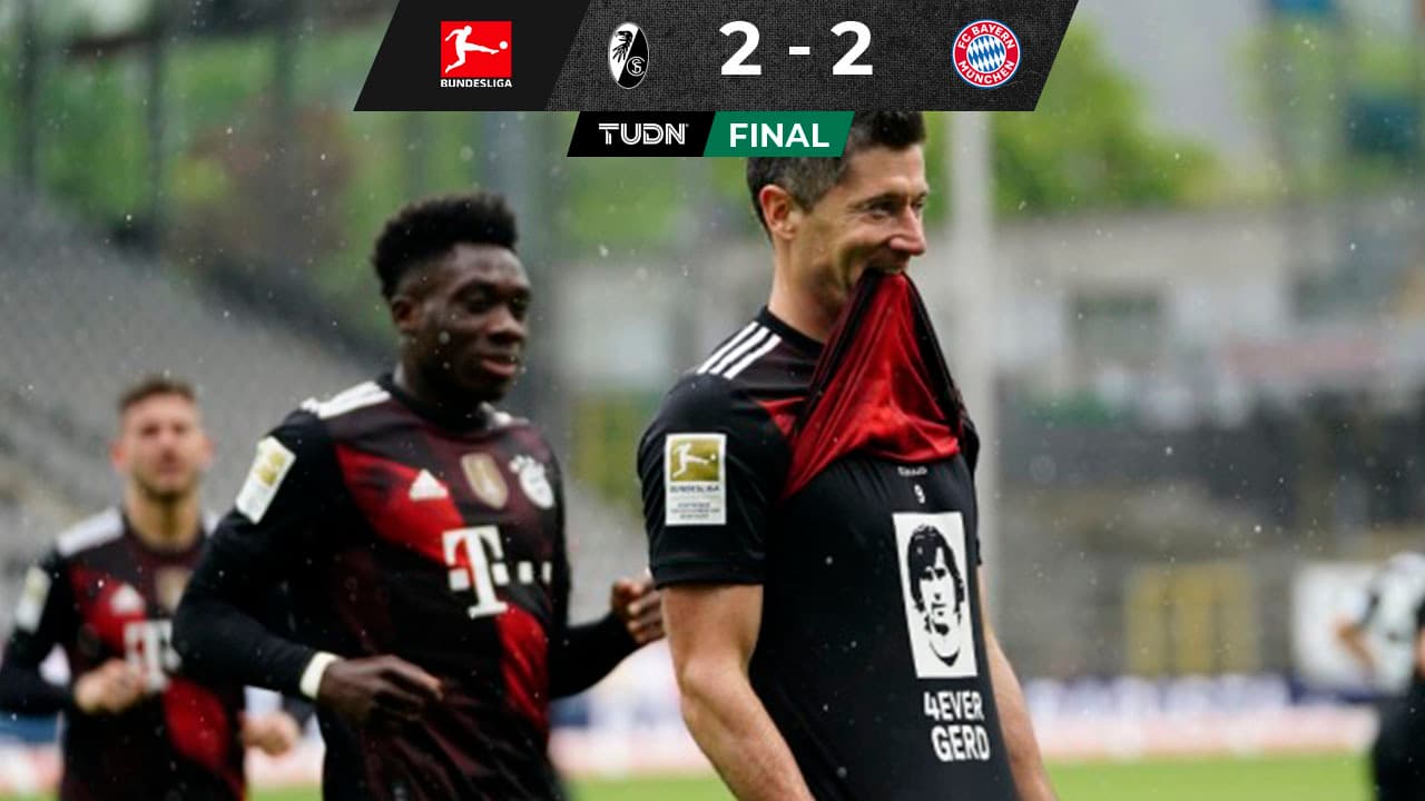 Robert Lewandowski l ogró llegar a 40 goles en la Bundesliga con lo cual igualó la marca de Gerd Müller en el empate 2-2 entre el Freiburg y el campeón Bayern Munich.