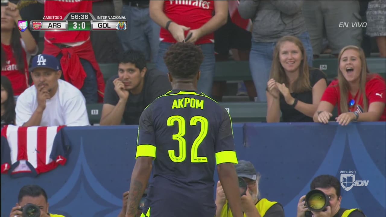 Ya en el segundo tiempo, el Arsenal siguió siendo más que las Chivas y al 50’ Oxlade-Chamberlain marcó el segundo luego de una espectacular jugada individual que culminó con un disparo que Toño Rodríguez no pudo atajar. Seis minutos después el conjunto de los ‘Gunners’ marcaron el 3-0 gracias al gol de Akpom, que aprovechó la mala marca de los defensores de Chivas.