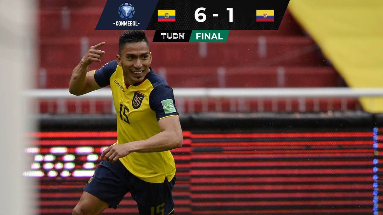 Ecuador venció por un humillante 6-1 a Colombia en la cuarta fecha de las Eliminatorias de la Conmebol al Mundial de Qatar 2022, choque que se disputó en el Estadio Rodrigo Paz Delgado de Quito.
