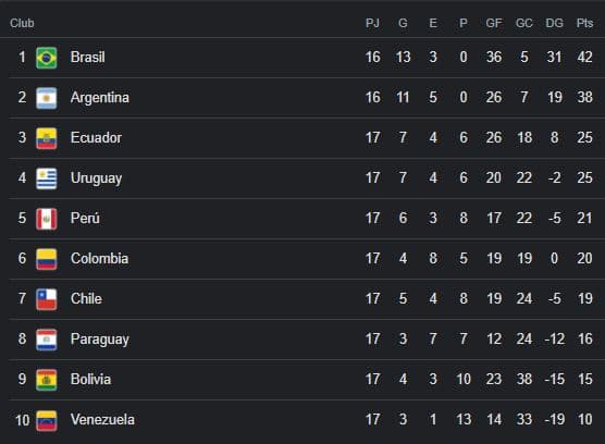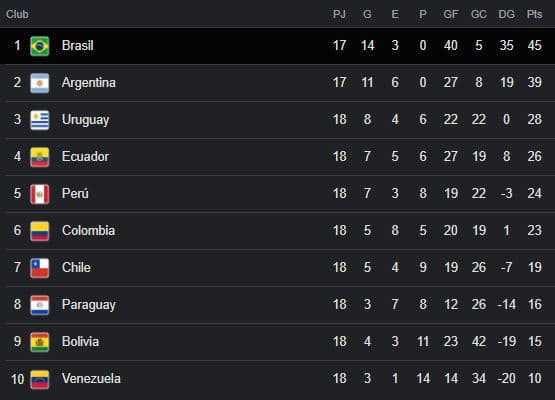 Después de 18 jornadas y solo un partido pendiente (Brasil vs Argentina), así quedó la tabla de las Eliminatorias Conmebol con los primeros cuatro clasificados (Brasil, Argentina, Uruguay y Ecuador) y el quinto lugar en el Repechaje Intercontinental (Perú).