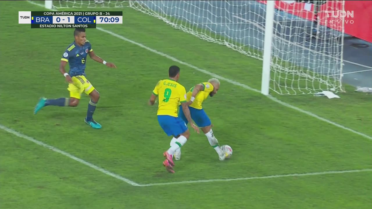 Al minuto 77, Brasil tenía la pelota, intentaron filtrar un balón al área, pero este le pegó al silbante, quien amagó claramente con pitar y detener el juego, para instantes después dejar correrla jugada al ver que el balón seguía en posesión de Brasil y así permitir que Renan Lodi metiera un gran centro para la llegada de Firmino, quien remató pleno y puso el 1-1 ante la impávida defensa visitante.