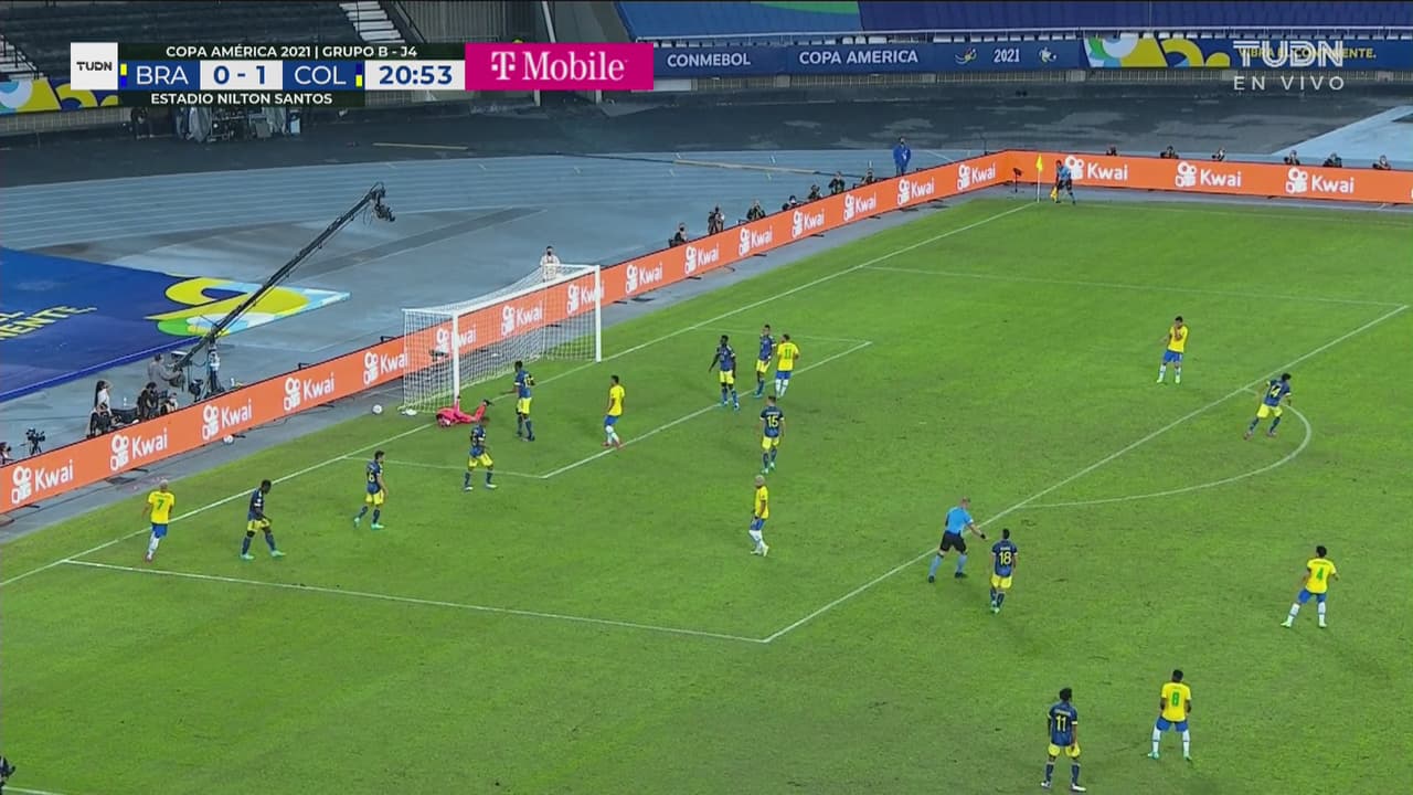 El jugador brasileño remata de zurda y encuentra bien parado al portero colombiano al 20'.