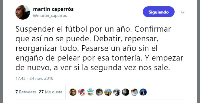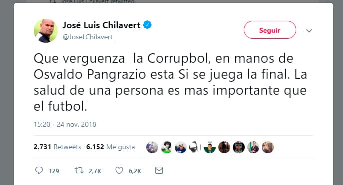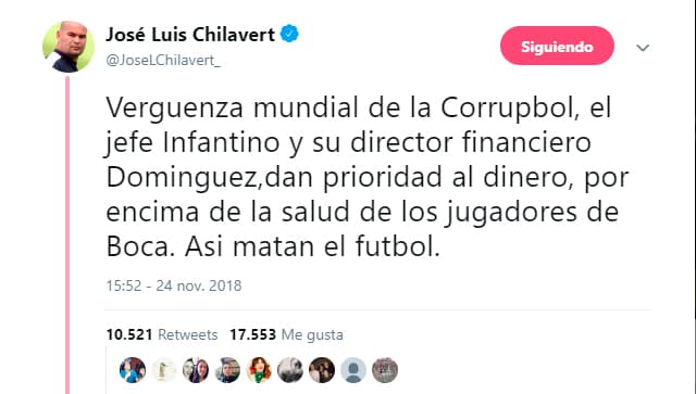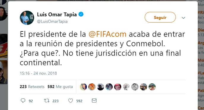 Pero, de acuerdo a informes de la prensa argentina, Conmebol y River Plate ya ven en Boca Juniors a un ‘traidor’, toda vez que el presidente xeneize firmó el sábado el acuerdo para que el partido se disputara el domingo junto a su homólogo ‘millonario’ Rodolfo D’Onofrio y el titular de la Confederación, Alejandro Domínguez. Por ello, les sorprendió tanto el cambio de postura de un día para el otro y ya buscan vericuetos técnicos para que La Final no se resuelva en el escritorio.