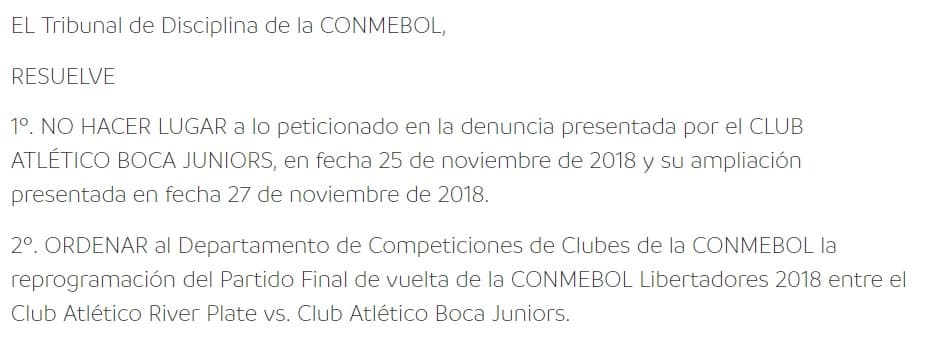 A través de un comunicado, el Tribunal de Disciplina de la Conmebol desechó la petición de Boca Juniors de no jugar el partido y ser condecorado como campeón por los incidentes violentos en las inmediaciones del estadio Monumental, además de ordenar la reprogramación del encuentro.